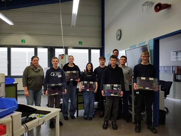 (v. links: Techniklehrerin Birgit Steinmetz mit 9. Klässler/innen, Mitarbeiter und Auszubildende der Fa. Vantive im Hintergrund)